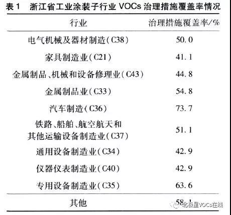 按工业涂装国民经济子行业进行分类统汁,浙江省工业涂装子行业VOCs治理措施覆盖率情况见表1。